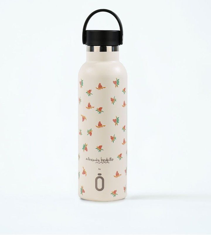 Botella termo Runbott Alexandra Bordallo de 600 ml, fabricada en acero inoxidable, ideal para mantener tus bebidas calientes o frías durante horas. Diseño tropical con estampado de elementos en tonos naranja y verde sobre fondo blanco. Tapón negro con asa para mayor comodidad. Perfecta para el día a día, viajes o actividades al aire libre. Estilo e