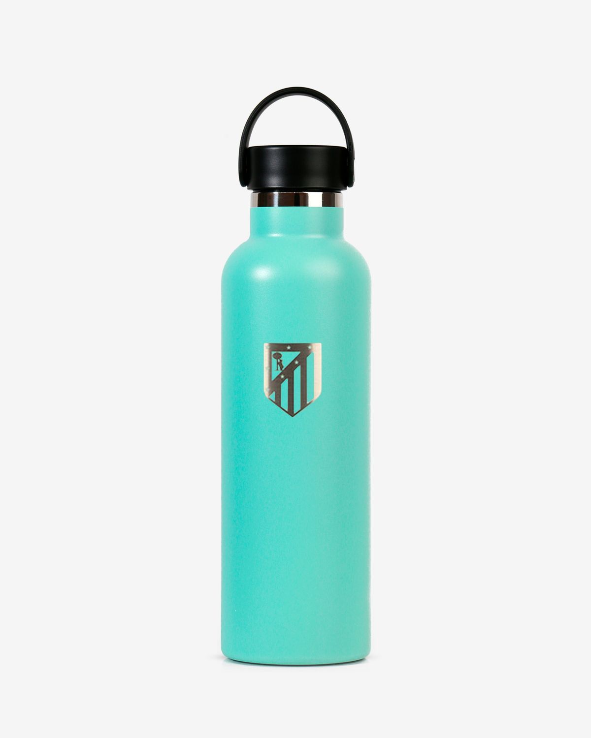 Botella termo Runbott Original del Atlético de Madrid en color menta, ideal para deportistas y aficionados. Fabricada en acero inoxidable, mantiene tus bebidas frías o calientes durante horas. Con escudo del equipo en tono plateado y tapa negra con asa, es práctica y elegante para llevar al entrenamiento, trabajo o viajes. Capacidad de 600 ml.