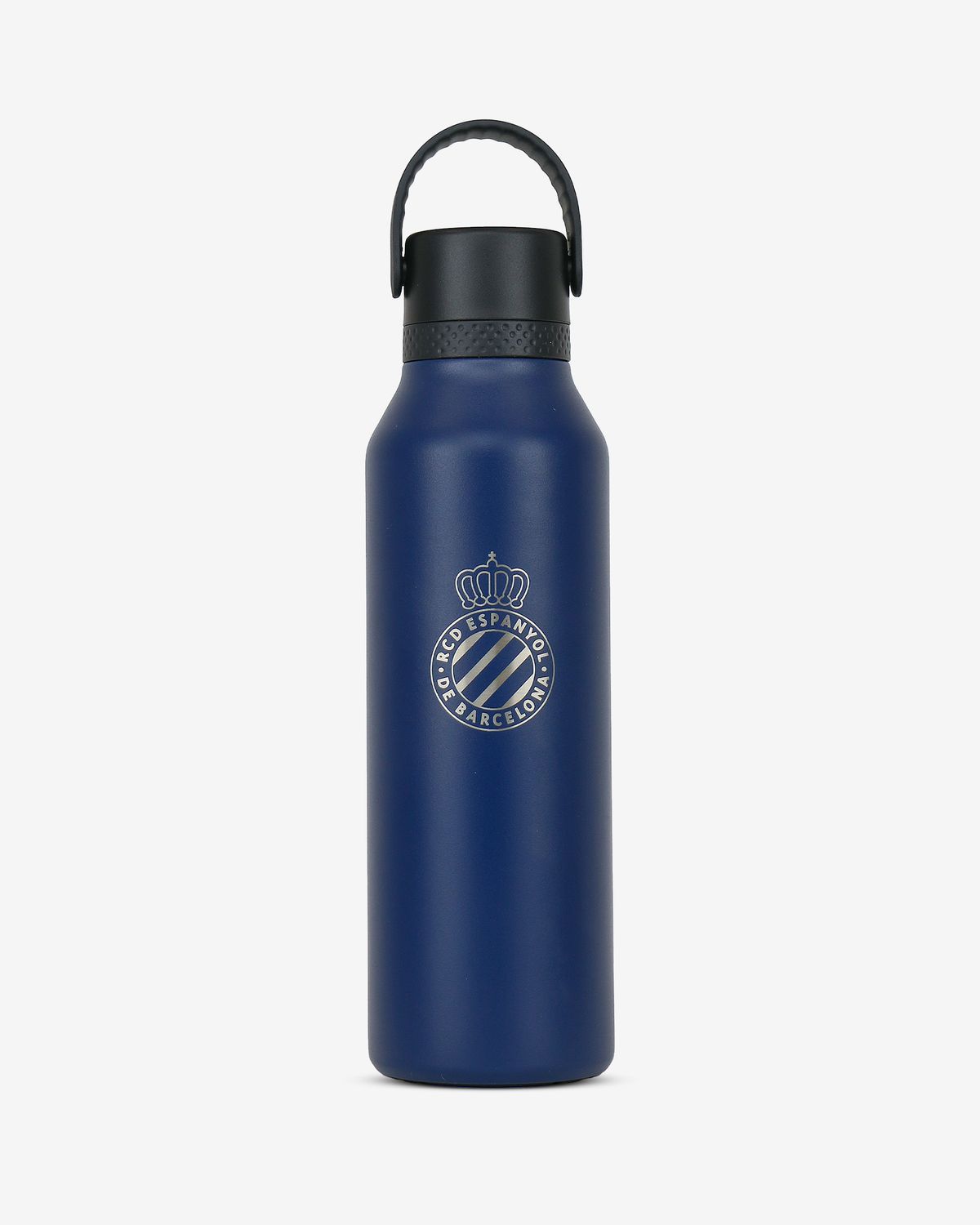 Botella termo Runbott Original Mii Espanyol Escudo de 600 ml en color azul marino, fabricada en acero inoxidable. Con escudo del RCD Espanyol en relieve plateado y tapa negra con asa, es perfecta para mantener tus bebidas calientes o frías durante horas. Ideal para aficionados al fútbol que buscan calidad y estilo en su día a día.