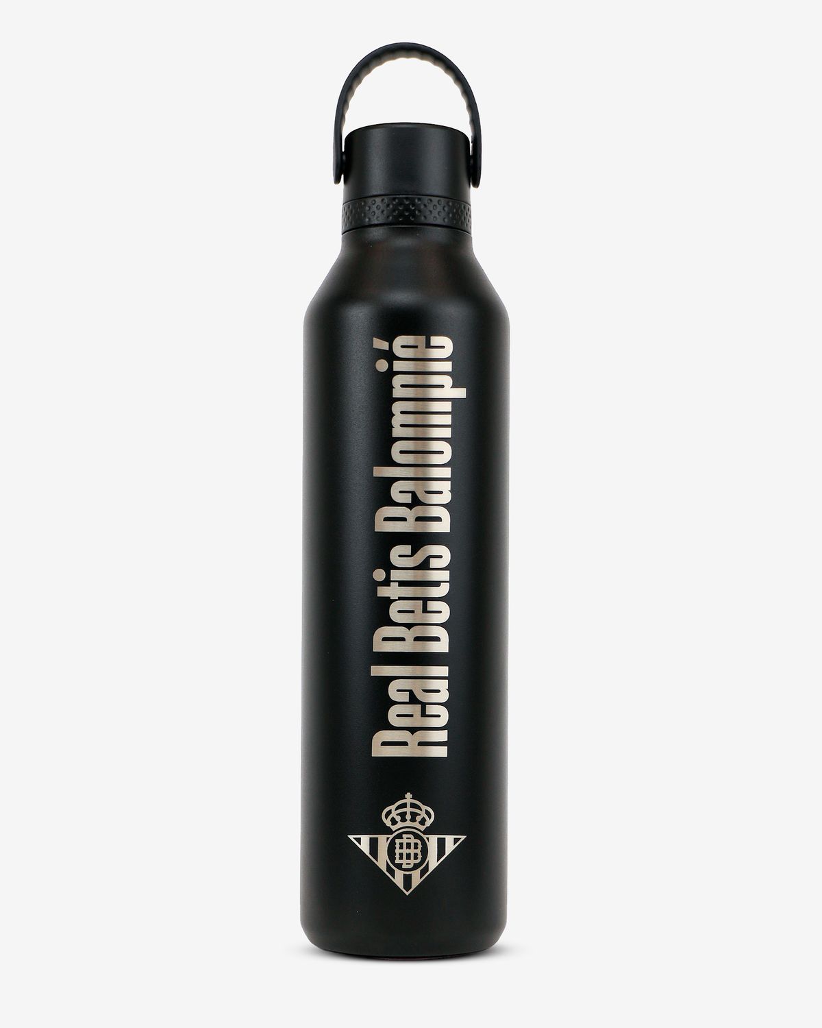 Botella termo oficial del Real Betis Balompie de 1 litro, fabricada en acero inoxidable de alta calidad. Diseño elegante en negro con detalles dorados, incluyendo el nombre del club y su escudo. Ideal para aficionados que quieren mantener sus bebidas calientes o frías durante horas. Perfecta para el día a día, entrenamientos o viajes.