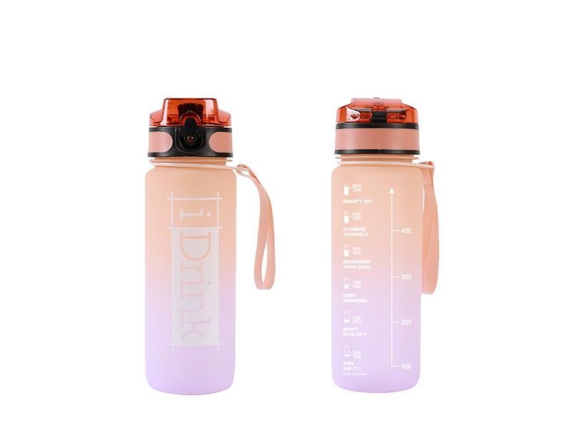 Botella Tritan de 750 ml con diseño degradado en tonos naranja y lila, ideal para llevar agua o bebidas durante el día. Fabricada en plástico resistente y seguro, cuenta con tapón de fácil apertura y asas laterales para mayor comodidad. Perfecta para deportistas, estudiantes o profesionales que buscan mantenerse hidratados en cualquier momento. Inc