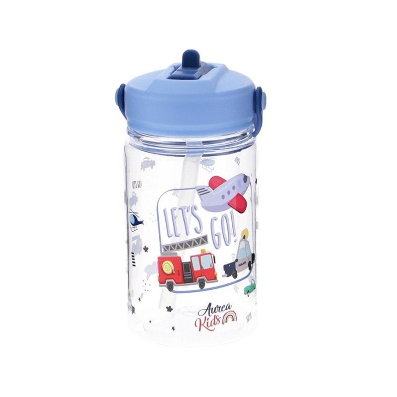 Botella infantil de Tritán de 350 ml con pajita, ideal para niños. Diseño divertido con vehículos y texto 'LET'S GO!' en tonos azul, rojo y blanco. Fabricada en plástico seguro, con tapa azul y asas laterales para un agarre fácil. Perfecta para el colegio, viajes o actividades diarias. Incluye pajita incorporada para beber cómodamente.