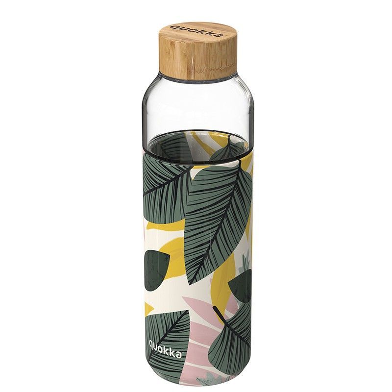 Botella de vidrio Quokka de 66 cl con diseño tropical de hojas en tonos verdes, amarillos y rosas. Ideal para llevar agua o infusiones de forma elegante y sostenible. Tapa de madera de bambú que aporta un toque natural. Perfecta para el día a día, el trabajo o el gimnasio. Reutilizable y libre de BPA.