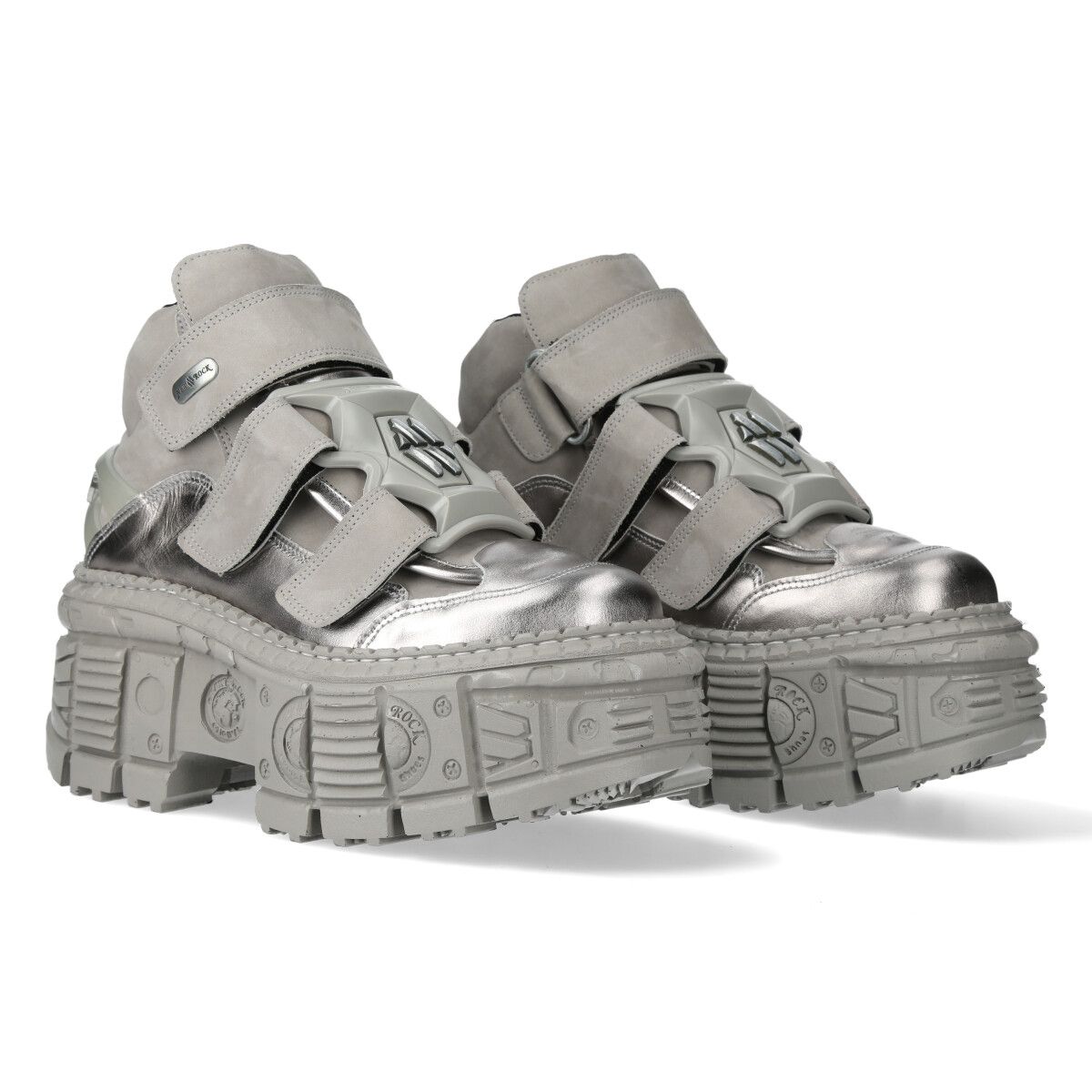 Botín New Rock M-WALL009-S3 en ante gris con detalles metálicos plateados, ideal para amantes del estilo industrial y urbano. Cierre con velcro y hebilla metálica para un ajuste seguro. Suela gruesa de goma con diseño técnico y detalles grabados. Calzado resistente y cómodo para uso diario o looks de moda alternativa.