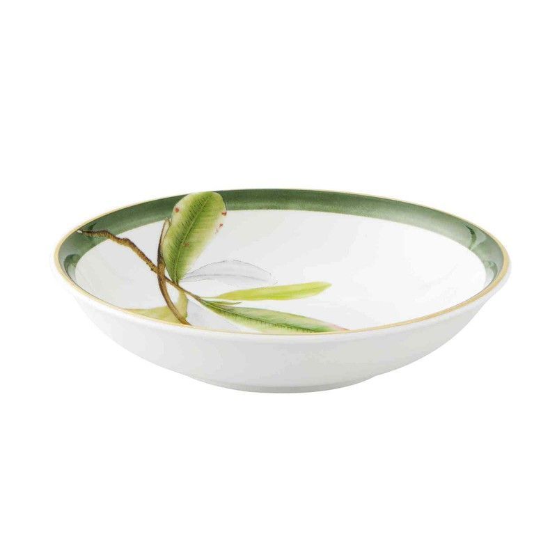 Bowl mediano llano de porcelana Amazónia con diseño de hoja verde, ideal para decorar tu mesa o servir alimentos con estilo. Su acabado blanco con detalles verdes y dorados aporta un toque natural y sofisticado. Perfecto para uso diario o ocasiones especiales, combina elegancia y funcionalidad en tu hogar.