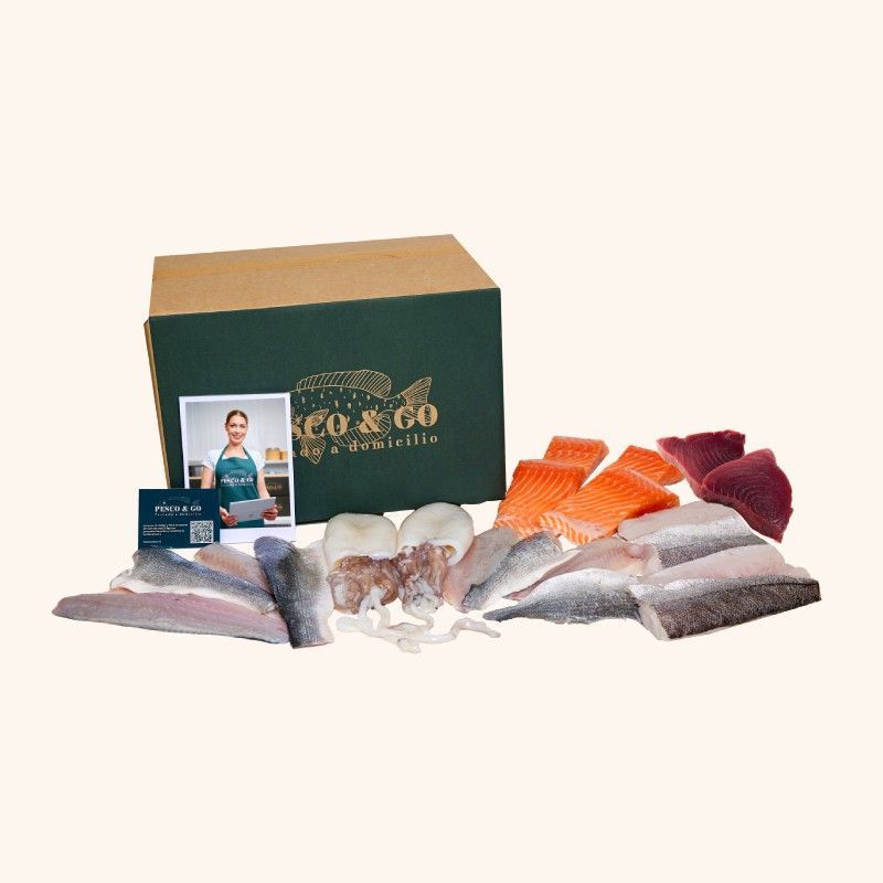 Box Single de pescado y marisco fresco congelado, ideal para cocinar en casa. Incluye filetes de salmón, atún, bacalao y mejillones, presentados en una caja de cartón con diseño elegante. Perfecto para amantes de la alimentación saludable y sostenible. Contenido variado y de alta calidad para preparar platos deliciosos en casa.