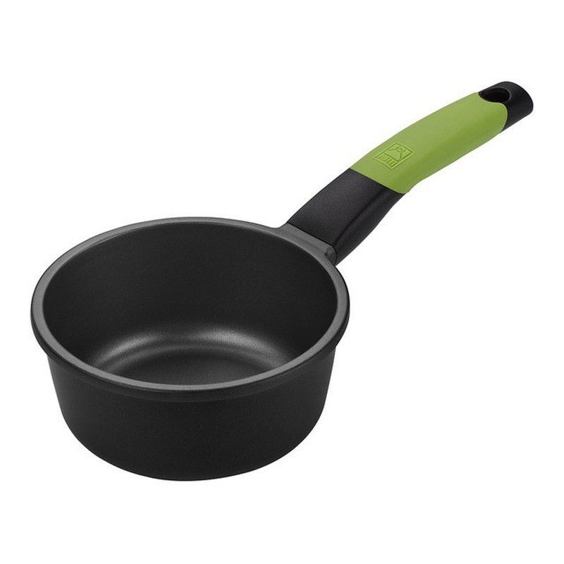 Cazo de cocina de 16 cm con acabado antiadherente, ideal para cocinar salsas, cremas y guisos con facilidad. Fabricado en acero inoxidable de alta calidad con mango ergonómico en color verde y negro para un agarre seguro. Perfecto para uso diario en hogares que buscan utensilios funcionales y duraderos.