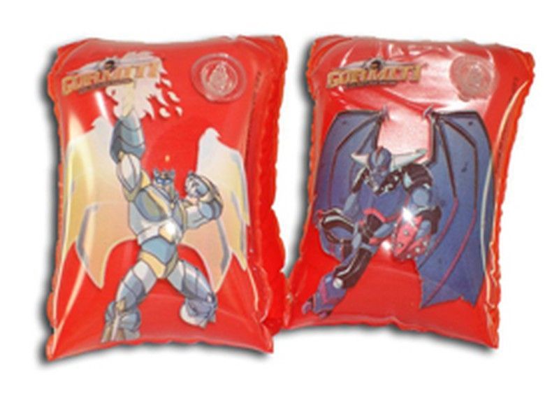 Brazalete inflable Gormiti para niños, ideal para juegos acuáticos y piscina. Fabricado en plástico resistente, con diseño vibrante de personajes con alas y armadura. Perfecto para niños que disfrutan de aventuras acuáticas con sus héroes favoritos. Incluye dos brazales con ilustraciones distintas para mayor diversión.