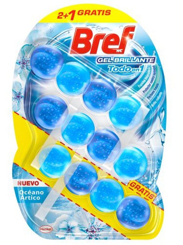 Bref WC Gel Brillante Océano Ártico, pack 2+1 gratis. Perlas de gel azul que limpian, desinfectan y perfuman el inodoro con aroma fresco y refrescante. Ideal para mantener el baño limpio y con olor agradable. Embalaje práctico y atractivo con diseño acuático.
