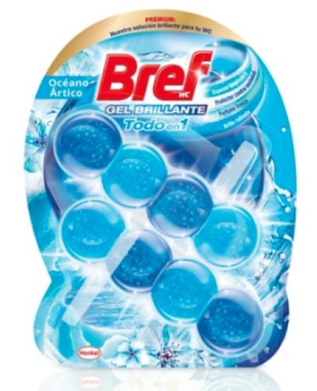 Bref WC Gel Brillante Océano Ártico: perlas de gel todo en 1 para un inodoro limpio, brillante y con aroma fresco. Ideal para uso diario en el baño, con efecto duradero y diseño atractivo. Formato práctico en blister con perlas azules que limpian y desinfectan eficazmente.
