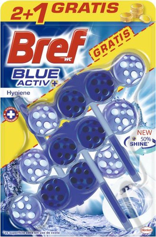 Bref WC Blue Activ+ en pack 2+1 gratis: perlas de limpieza para inodoro con efecto brillo intensificado. Ideal para mantener el inodoro limpio, higienizado y con un acabado brillante. Fórmula avanzada para una limpieza profunda sin esfuerzo. Perfecto para uso diario en el hogar.