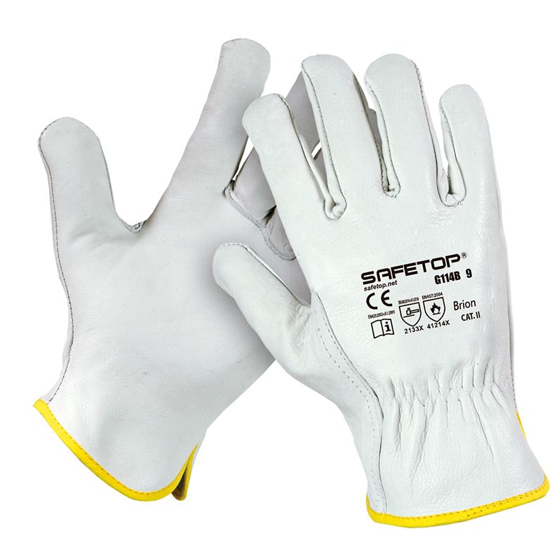 Guante de seguridad BRION en piel de alta calidad, resistente hasta 100ºC, ideal para trabajos industriales y manipulación térmica. Diseño ergonómico con ribete amarillo en muñeca para mayor visibilidad. Fabricado con piel natural, ofrece protección, comodidad y durabilidad. Perfecto para profesionales que requieren resistencia térmica y agarre seg