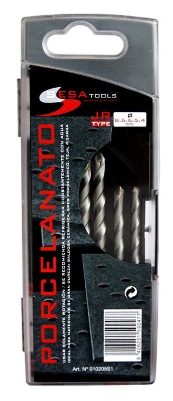 Juego de 5 brocas para porcelanato de ESA Tools, ideales para perforar baldosas cerámicas, granito, mármol y piedra. Con diseño tipo JR y punta helicoidal, ofrecen precisión y durabilidad. Incluye tamaños 4, 6,5 y 8,6 mm. Embalaje tipo blister con información clara y profesional. Perfectas para trabajos de bricolaje y construcción.
