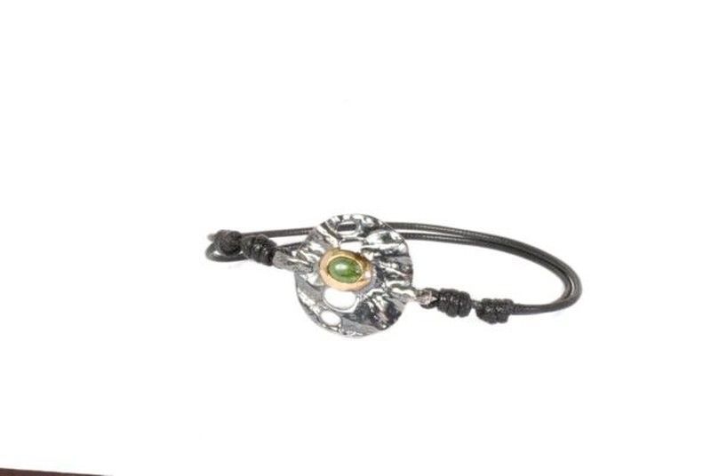 Pulsera BRU1847p 'la bruixeta' con diseño circular en plata rugosa ennegrecida y goma elástica negra. Destaca por su piedra verde en el centro y cierre ajustable con nudos. Ideal para adultos que buscan joyería con estilo bohemio y elegante. Perfecta para combinar con looks casuales o sofisticados.