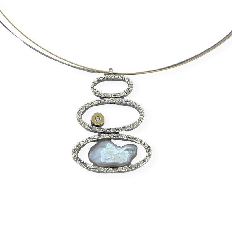 Colgante BRU2083CCB 'la bruixeta' en plata, oro, perla y diamante. Diseño sofisticado con tres anillos superpuestos y textura grabada. La perla de forma irregular aporta un toque único y el diamante brilla con elegancia. Ideal para mujeres que buscan joyas con personalidad y calidad. Perfecto para ocasiones especiales o como pieza de colección.