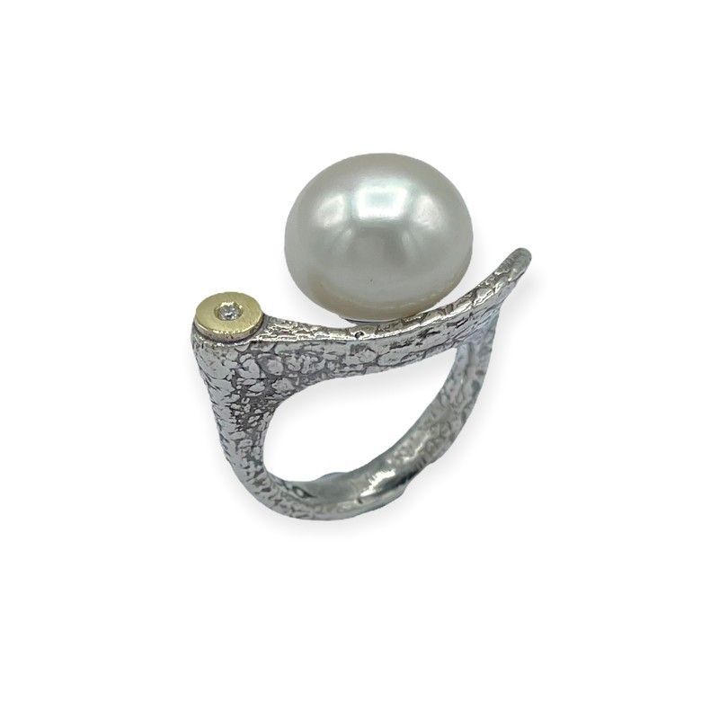 Anillo BRU2090SG 'La Bruixeta' en plata con textura única, perla natural y detalle en oro con diamante. Diseño elegante y sofisticado, ideal para mujeres que buscan joyas con personalidad. Perfecto para ocasiones especiales o como pieza destacada en tu colección de joyas. Calidad premium y acabado impecable.