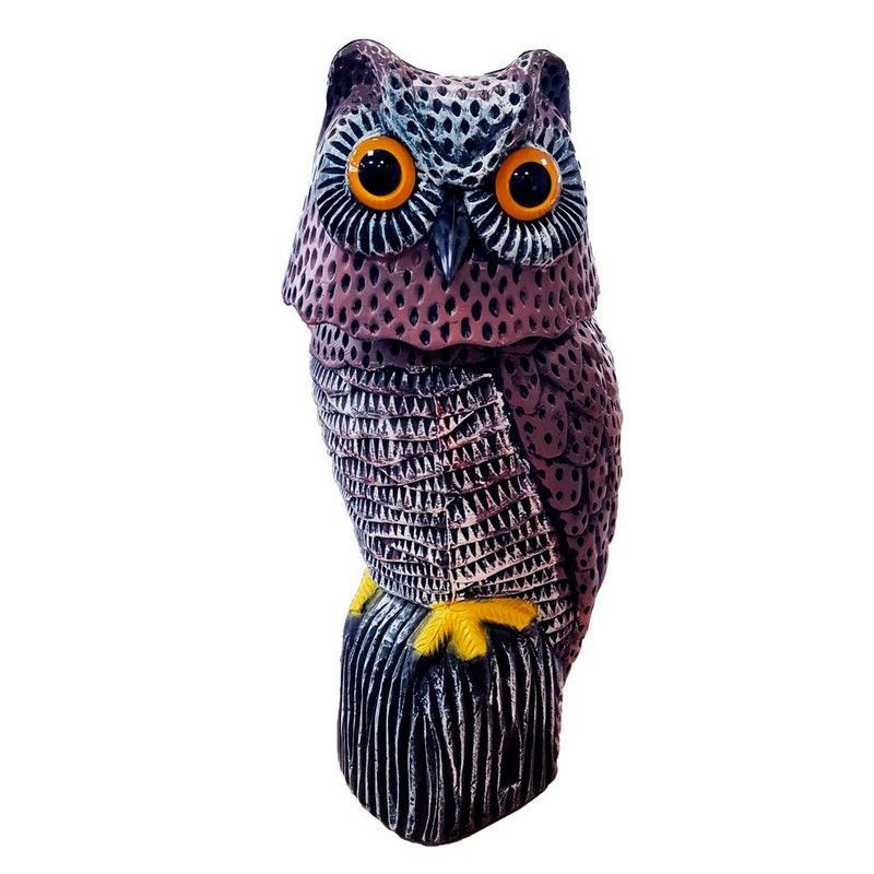 Buho decorativo con cabeza giratoria para ahuyentar aves del jardín o terraza. Fabricado en plástico resistente, con diseño realista y detalles en morado, negro y amarillo. Ideal para proteger plantas y cultivos sin usar productos químicos. Fácil instalación y efectivo en exteriores.