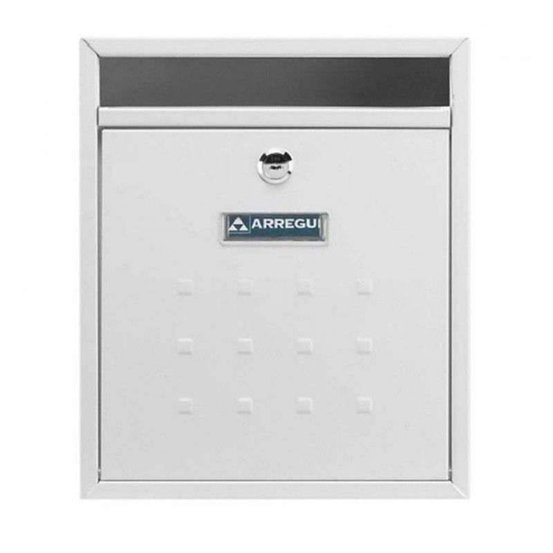 Buzón interior de diseño rectangular con marco blanco y panel superior grisCerradura metálica en la parte superior centralPlaca con logotipo arregui en azul y blancoSuperficie con relieve en forma de cuadrados pequeños distribuidos en rejillaDimensiones aproximadas 26x9x31 cm