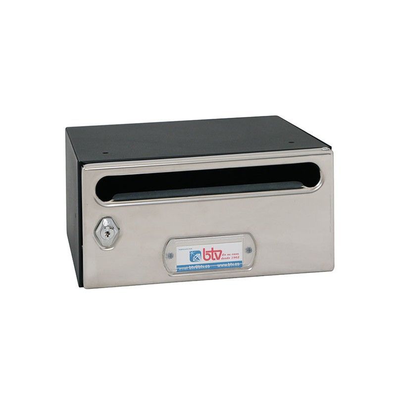 Buzón interior horizontal con acabado metálico brillanteAbertura rectangular en la parte superior para introducir correspondenciaCerradura con llave en el lateral izquierdoEtiqueta con logotipo btv en la parte frontalDimensiones compactas para instalación en pared o mueble