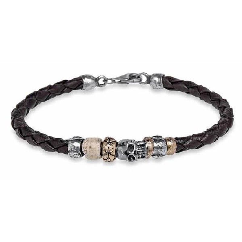 Pulsera unisex CAB39C con diseño robusto y estilo urbano. Fabricada con cuero trenzado negro, cuentas de plata, bronce y resina, incluyendo una calavera detallada. Ideal para hombres y mujeres que buscan un accesorio versátil y con personalidad. Cierre de cadena metálica para ajuste seguro. Perfecta para combinar con looks casuales o rockeros.