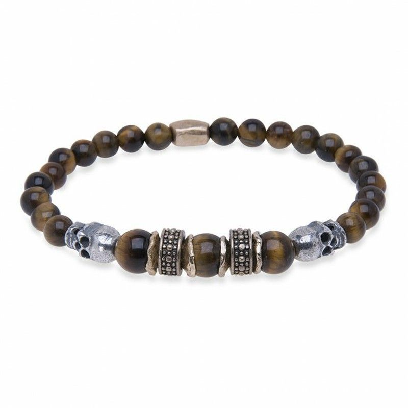 CAB77A Pulsera unisex PLATA DE PALO en plata, ojo de tigre y dos calaveras