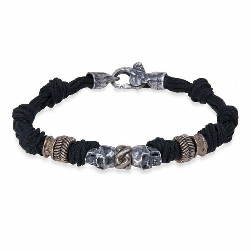 Pulsera CAB81B SKULL LOVE COLOURS NEGRA con cuerda trenzada negra y detalles metálicos en acabado plateado. Diseño con cráneos y eslabones decorativos, ideal para adultos que buscan un estilo urbano y atrevido. Cierre de mosquetón seguro y ajustable. Perfecta para combinar con looks casuales o rockeros.