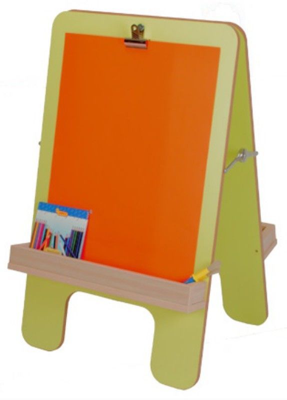 Caballete infantil de madera ideal para niños y niñas que aman dibujar y pintar. Con estructura estable en forma de A, superficie de dibujo con papel naranja sujeto por pinza y bandeja inferior para guardar lápices y materiales. Diseño seguro y funcional para fomentar la creatividad en casa o en clase.
