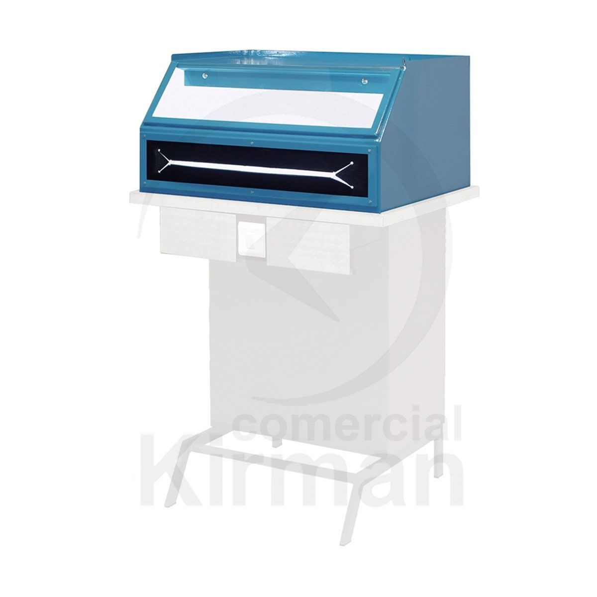 Cabina de aspiración sobremesa modelo 16107, fabricada en acero inoxidable para mayor durabilidad. Diseño compacto y funcional con panel frontal azul y ventana transparente, ideal para espacios de trabajo en talleres, laboratorios o áreas de soldadura. Incluye base blanca con soporte metálico para una instalación estable. Solución eficiente para la