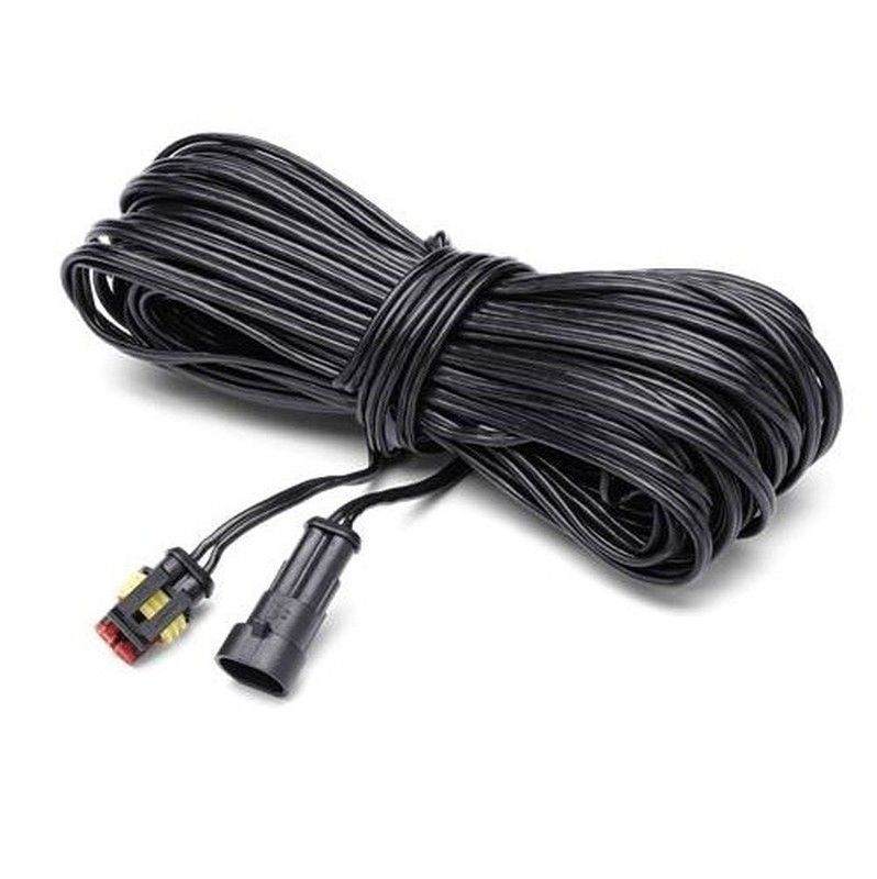 Cable de baja tensión de 20 metros para robot cortacésped Automower 220 AC. Conectores robustos en ambos extremos, uno con terminales rojo y amarillo, otro tipo macho negro. Ideal para extender la conexión eléctrica del sistema de guía del robot cortacésped. Fabricado en plástico resistente y cable eléctrico de alta calidad para uso exterior. Soluc