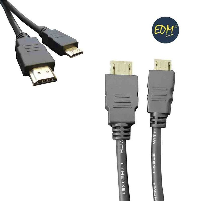 Cable HDMI macho a mini HDMI macho de 1.5 metros, ideal para conectar dispositivos como cámaras, reproductores portátiles o tablets a televisores y monitores. Fabricado con conectores metálicos resistentes y carcasa de plástico de alta calidad, incluye tecnología Ethernet para una conexión estable. Perfecto para usuarios que buscan una solución con