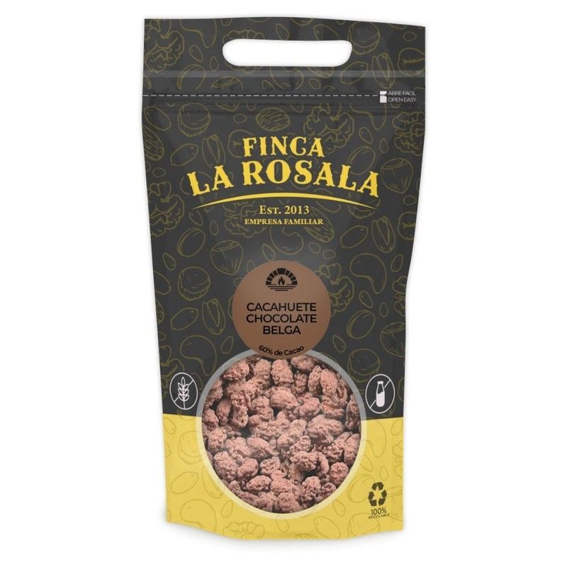 Cacahuetes cubiertos con chocolate negro belga al 60% de cacao, en bolsa de 500 grs de la marca Finca La Rosala, empresa familiar desde 2013. Ideal para disfrutar como snack saludable y gourmet, con un sabor intenso y textura crujiente. Perfecto para regalar o consumir en cualquier momento del día.