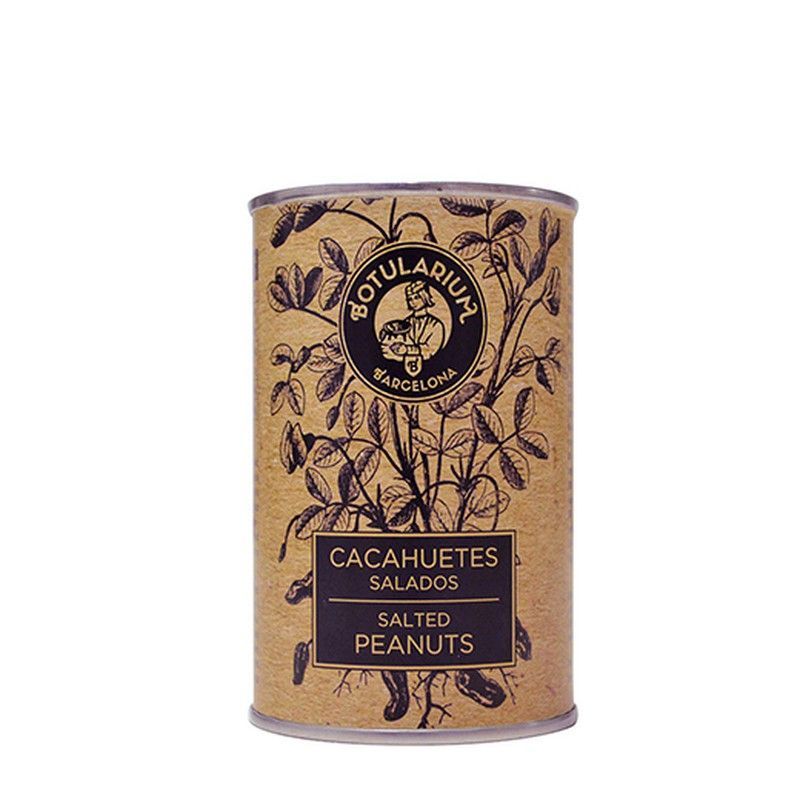 Cacahuetes salados de 150 grs en elegante envase metálico de Botularium, con diseño botánico en tonos marrón y negro. Ideal para disfrutar como snack saludable, regalo gourmet o acompañamiento de vinos. Producto de Barcelona con calidad premium.