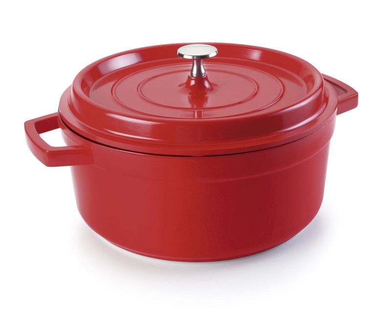 Cacerola cocotte de aluminio fundido en color rojo intenso, ideal para cocinar a fuego lento y mantener los alimentos tiernos y sabrosos. Con tapa hermética y asas laterales para un manejo seguro, es perfecta para estofados, guisos y arroces. Su acabado en esmalte resistente garantiza una larga durabilidad y fácil limpieza. Ideal para cocineros que