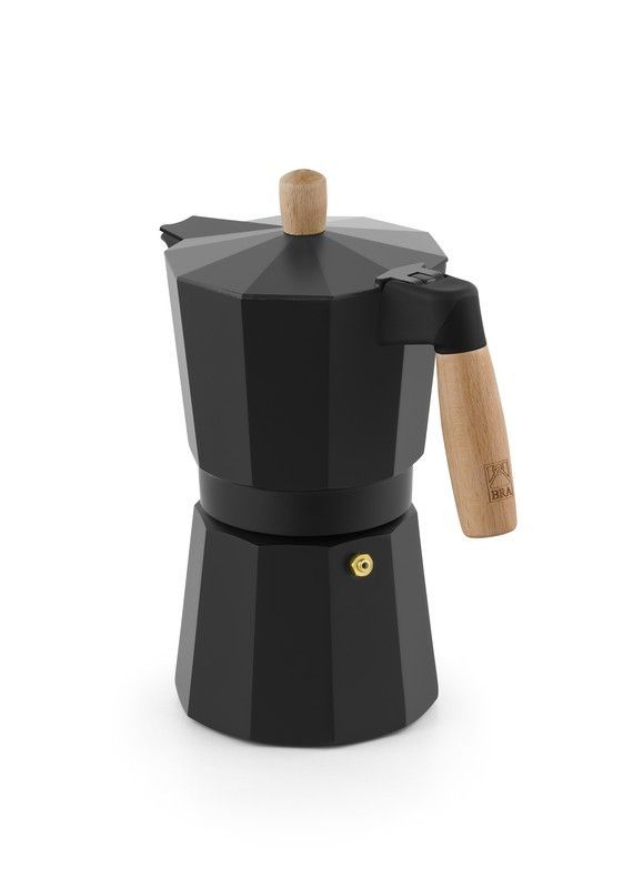 Cafetera de 12 tazas con diseño moderno y elegante, fabricada en acero inoxidable con detalles en madera natural. Ideal para amantes del café que buscan calidad y estilo en su cocina. Su forma octogonal y acabado negro la convierten en un accesorio funcional y decorativo. Perfecta para uso diario en casa o en el desayuno con familia y amigos.