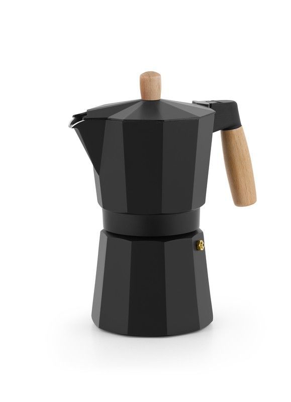 Cafetera de 6 tazas con diseño moderno y acabado en negro mate. Fabricada en acero inoxidable de alta calidad con manija y tapón de madera natural para un toque elegante y funcional. Ideal para amantes del café que buscan estilo y durabilidad en su cocina. Perfecta para uso diario en casa o en el desayuno con familia y amigos.