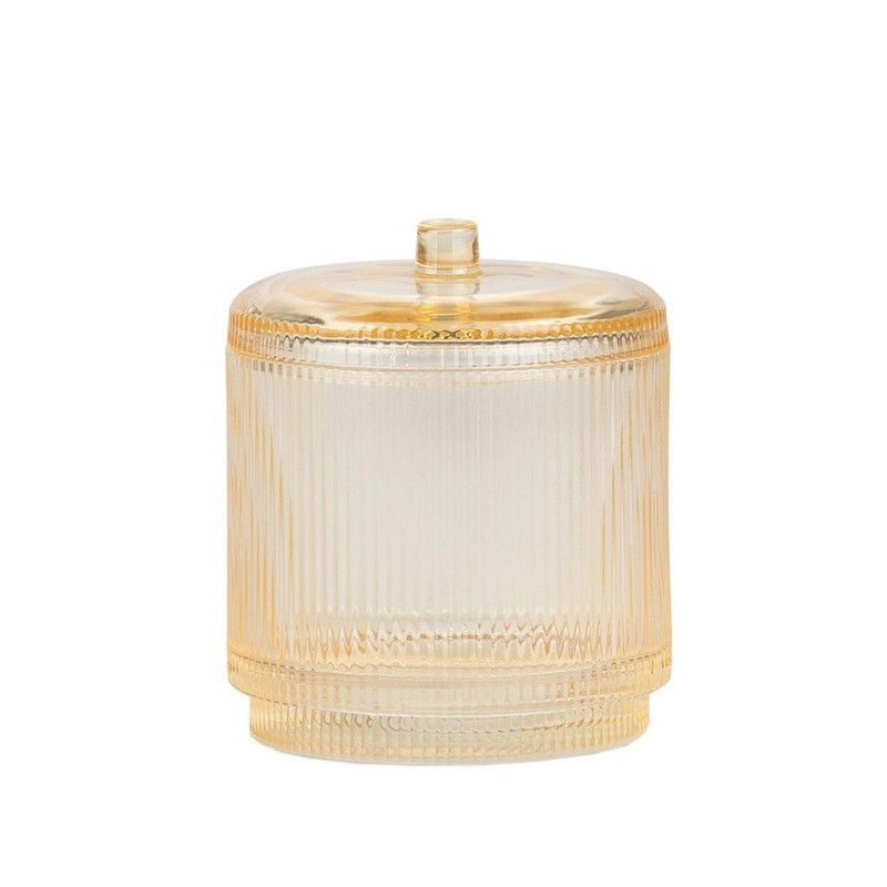 Caja decorativa de cristal en tono miel, ideal para el baño o como elemento decorativo en el hogar. Con tapa y diseño elegante con surcos verticales, aporta un toque sofisticado y luminoso a cualquier espacio. Perfecta para almacenar pequeños objetos o como complemento estético en estanterías, mesitas o tocadores.