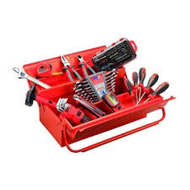 Caja de herramientas con 3 bandejas y 65 piezas, ideal para bricolaje y reparaciones en casa. Diseño organizado con compartimentos para destornilladores, llaves, pinzas y brocas. Color rojo vibrante y estructura resistente con asa metálica para fácil transporte. Perfecta para entusiastas del DIY y profesionales que buscan orden y eficiencia.