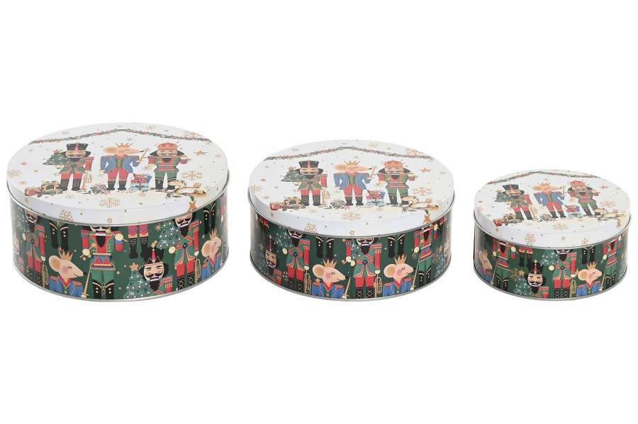 Set de 3 cajas metálicas navideñas con diseño de cascanueces, perfectas para decorar tu hogar en Navidad o como regalo original. Cada caja presenta un estampado festivo con figuras de cascanueces en trajes tradicionales sobre fondo blanco y verde. Ideales para almacenar pequeños regalos, dulces o como elementos decorativos. Tres tamaños disponibles