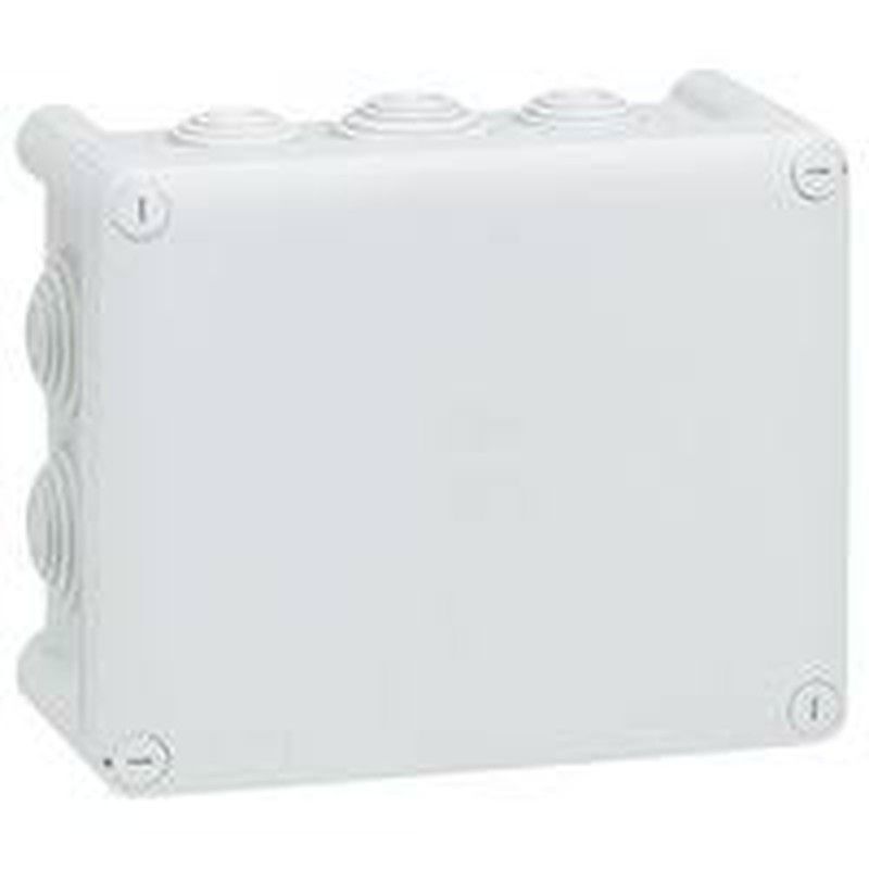 Caja rectangular de plástico blanco, ideal para instalaciones eléctricas o de cableado en entornos exigentes. Con protección IP 55 contra polvo y agua y IK 07 contra impactos, cuenta con 24 entradas para cables. Diseño robusto y funcional, perfecta para uso industrial o exterior. Dimensiones: 310x240x124 mm.