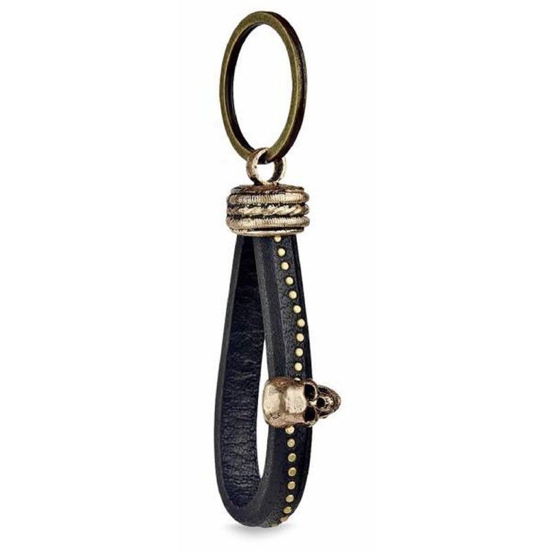 Llavero CAK1A con diseño elegante y atrevido, fabricado en cuero negro y detalles metálicos en bronce y dorado. Incluye remaches y un adorno de calavera que le dan un toque distintivo. Ideal para adultos que buscan accesorios con estilo rockero o vintage. Perfecto para llaves, bolsos o mochilas.
