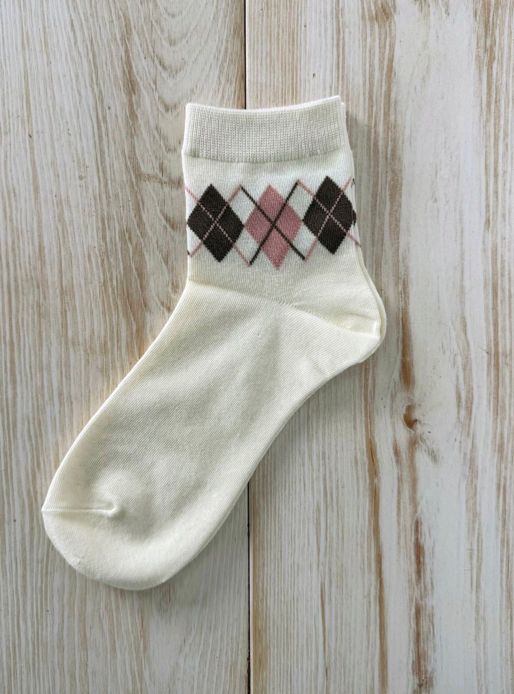 Calcetín de algodón con diseño de rombos en tonos marrón y rosa sobre fondo blanco. Ideal para adultos que buscan un toque clásico y elegante en su vestimenta diaria. Con ribete elástico para un ajuste cómodo y duradero. Perfecto para combinar con vestimenta casual o semi-formal.
