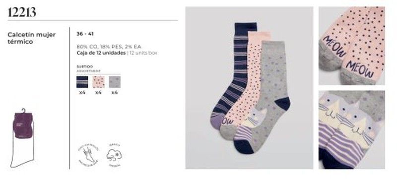 Calcetines térmicos para mujer en tallas 36-41, con mezcla de algodón, poliéster y elastano para mayor comodidad y elasticidad. Diseño divertido con estampados de gatos, lunares y texto 'MEOW'. Pack de 12 unidades con combinación de colores suaves como rosa, gris y azul marino. Ideales para mantener los pies calientes y cómodos en días fríos. Perfe