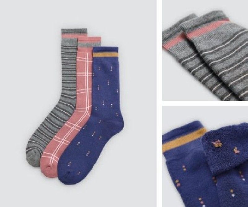 Calcetines térmicos para mujer en pack de tres, ideales para mantener los pies calientes en temporada fría. Confeccionados en mezcla de algodón y poliéster, ofrecen comodidad y suavidad. Diseños variados: rayas grises, cuadros rosas y puntos azules con ribete dorado. Perfectos para uso diario y combinables con cualquier look casual o deportivo.