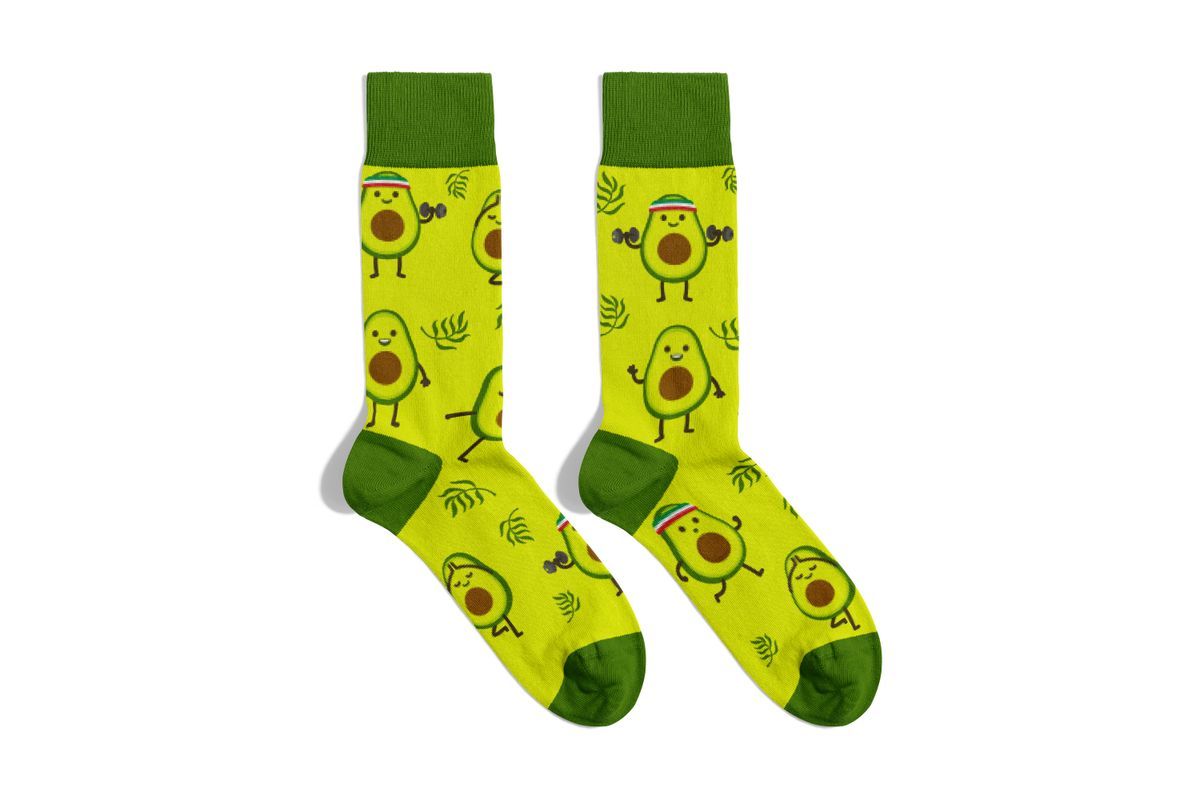 Calcetines divertidos con estampado de aguacates antropomórficos en tonos verde y amarillo, ideales como regalo original. Hechos en mezcla de algodón y poliéster, cómodos y resistentes. Talla M (36-40), perfectos para adultos que buscan un toque de humor en su vestimenta diaria.