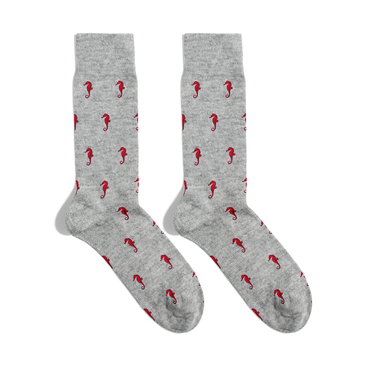 Calcetines divertidos con estampado de caballitos de mar rojos sobre fondo gris melange, ideales para adultos que buscan un toque de humor en su vestimenta diaria. Hechos con mezcla de algodón y poliéster para mayor comodidad y durabilidad. Talla M (36-40), perfectos como regalo original y práctico para cualquier ocasión.