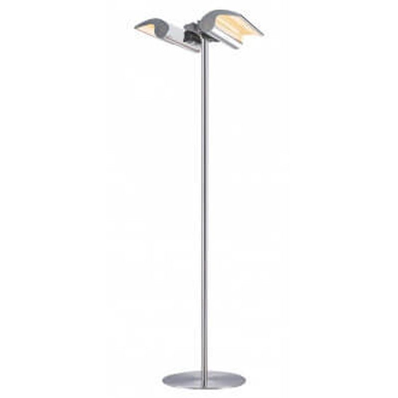 Calefactor de suelo doblemente reflectante con diseño moderno y acabado plateado. Fabricado en acero inoxidable, ofrece una distribución eficiente del calor gracias a sus dos cabezales orientables. Ideal para espacios como salones, terrazas o habitaciones, proporciona un ambiente cálido y acogedor. Fácil de colocar y con un estilo minimalista que s