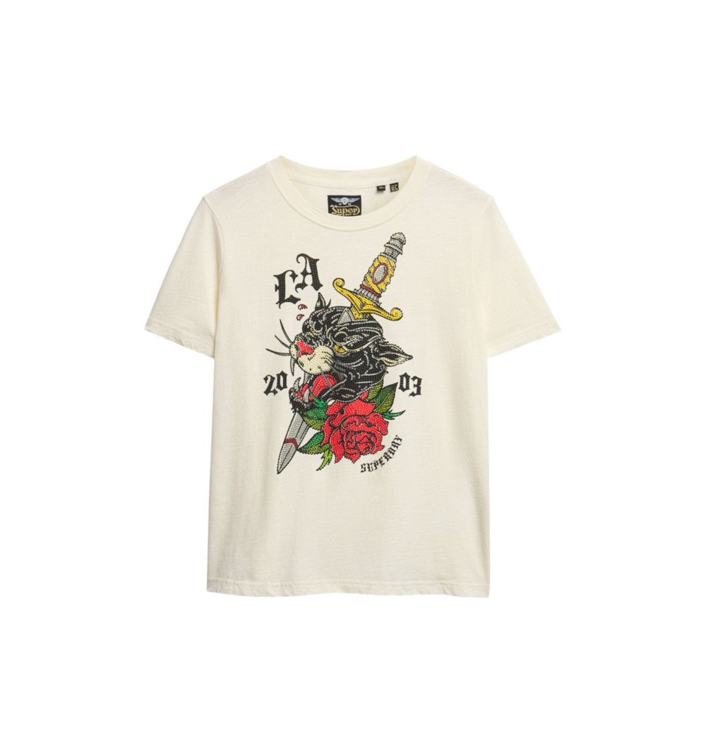 Camiseta de manga corta en color blanco con estampado tattoo multicolor de Superdry. Diseño detallado con gato, rosa, cuchillo y texto '2003', ideal para un look urbano y atrevido. Confeccionada en algodón de calidad, perfecta para usar en días casuales o como pieza de estilo streetwear.