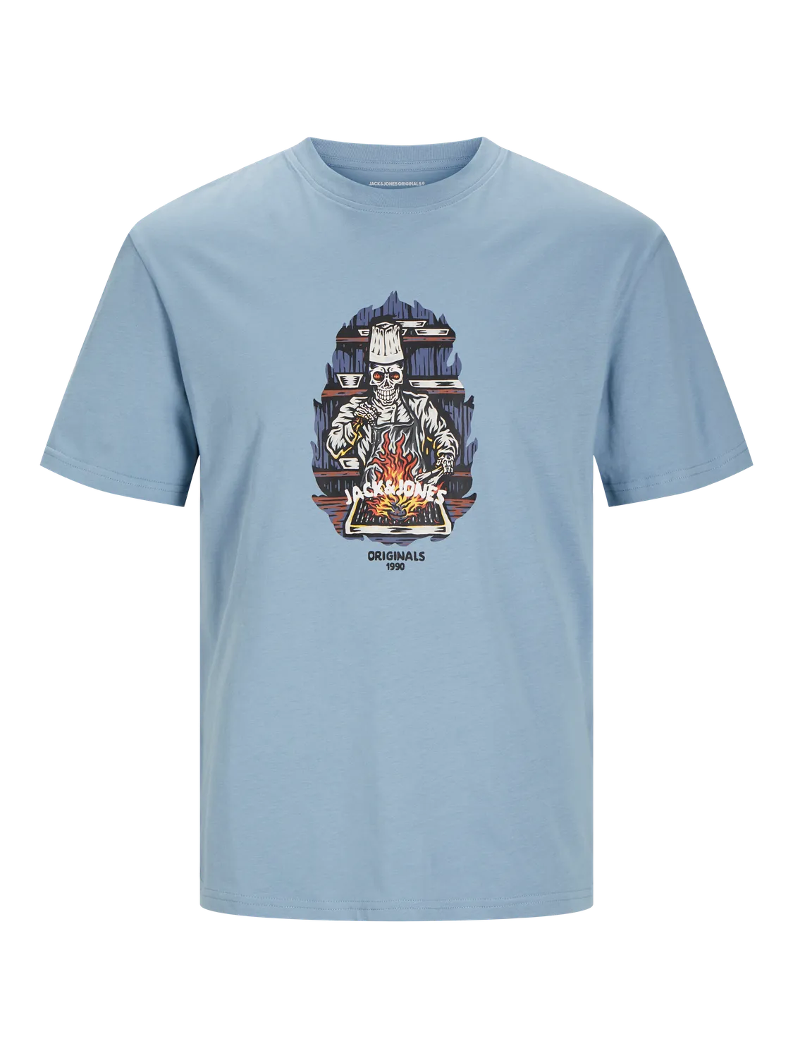 Camiseta de manga corta en color azul claro con estampado serigrafiado de Jack & Jones. Diseño original con cocinero esqueleto y detalles de parrilla, ideal para amantes de la moda urbana y streetwear. Confeccionada en algodón de calidad, cómoda y versátil para usar en el día a día. Perfecta para combinar con jeans o shorts.