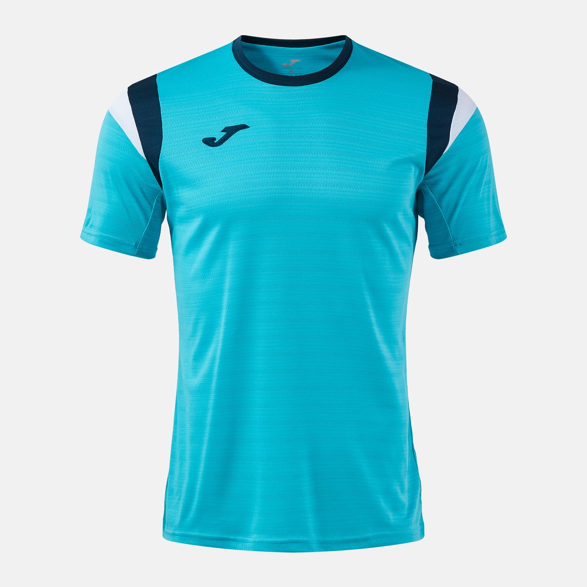 Camiseta deportiva Terra en color turquesa flúor con detalles en azul marino y blanco. Fabricada en poliéster transpirable, ideal para entrenamientos y partidos. Diseño ergonómico con paneles contrastados y logo de Joma. Perfecta para deportistas que buscan comodidad y estilo en sus actividades físicas.