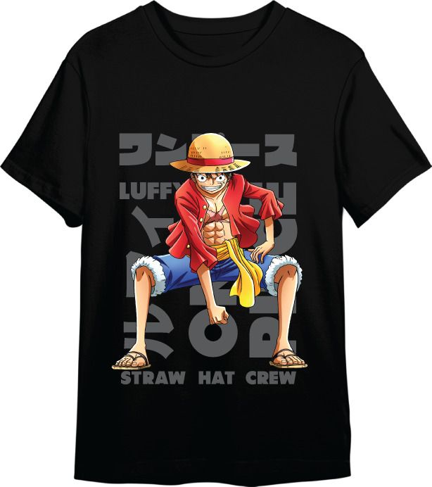 Camiseta negra para niños con estampado del icónico Luffy de One Piece, ideal para fans de la serie. Hecha en algodón suave y cómodo, presenta un diseño detallado con el personaje en pose dinámica, sombrero de paja, chaqueta roja y texto en japonés e inglés. Perfecta para usar en el día a día o en eventos temáticos.